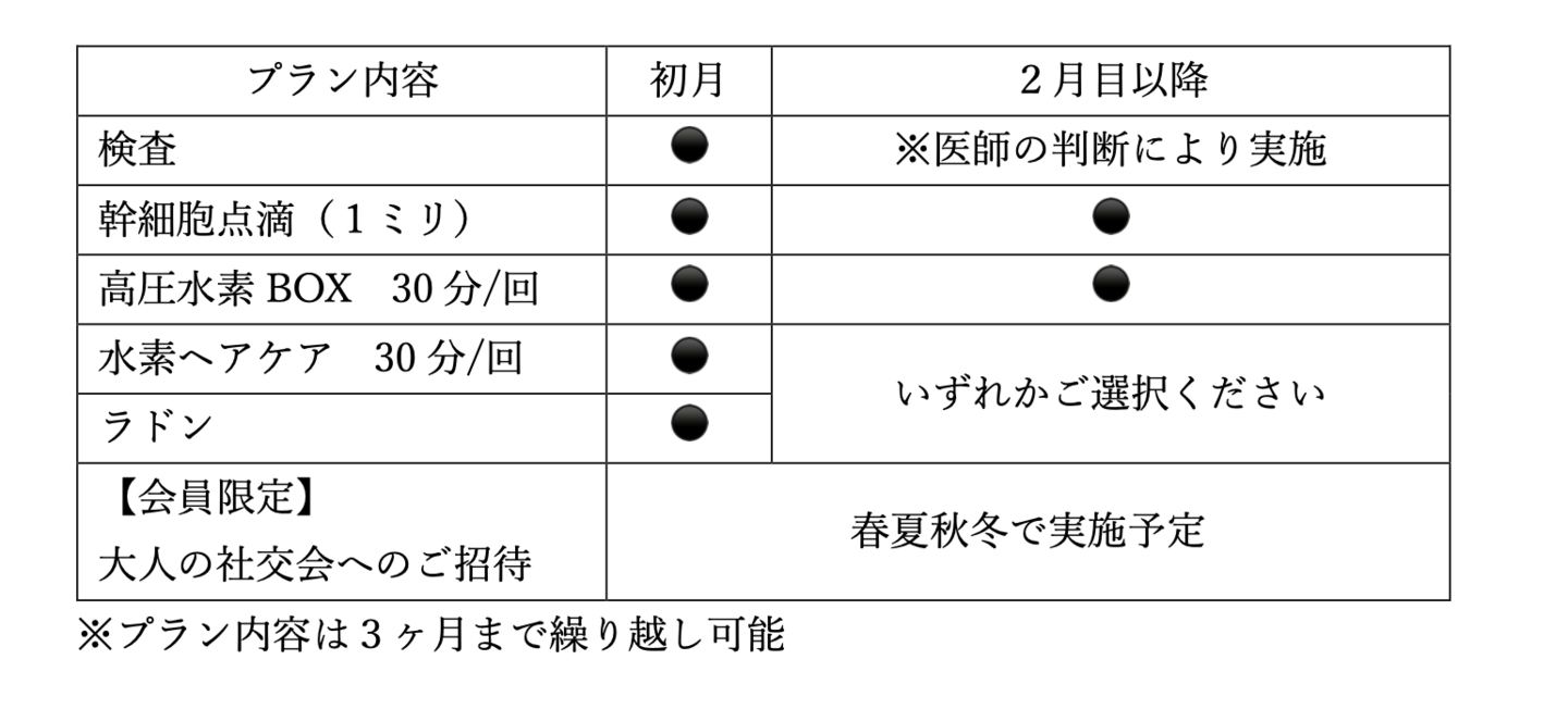 会員になるメリット | 最先端再生医療を定期的に受診可能 幹細胞培養上清液治療や水素療法など、最先端の医療プログラムを会員価格または定期スケジュールでご提供。 |